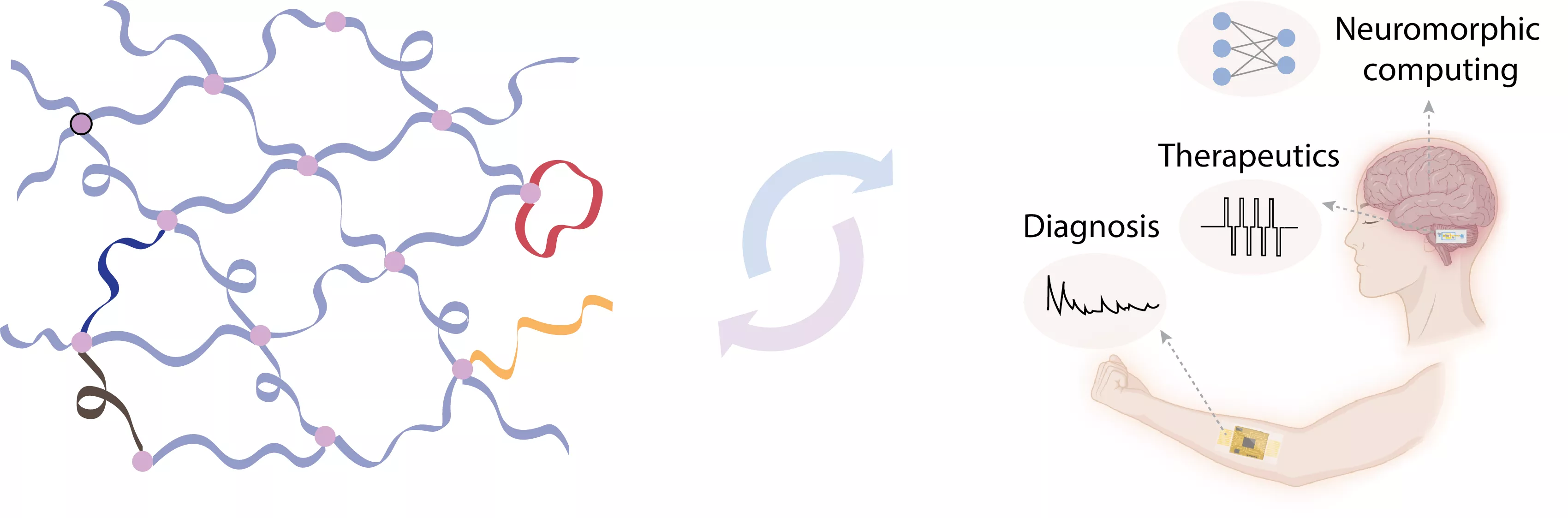 Built on fundamental principles of polymer chemistry and physics, our group aims to understand and control transport processes in electroactive polymer networks through molecularly programming their topology and dynamics under external stimulus. These fundamental insights will be applied to create bioelectronic materials and devices that are adaptive to various long-term operational scenarios when seamlessly integrated with human bodies.